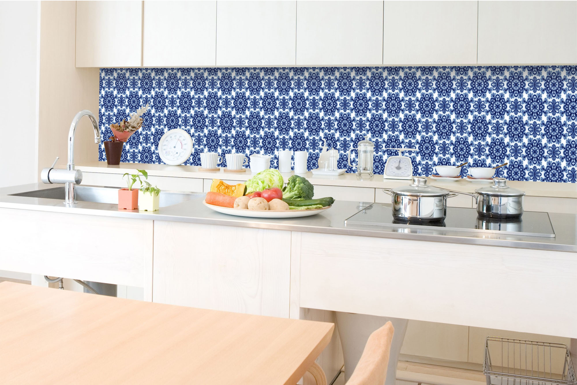 Küchenrückwandfolie lässt sich ausschließlich auf die nicht-saugfähige Unterlage kleben (Glas, Holz, keramische Fließen).