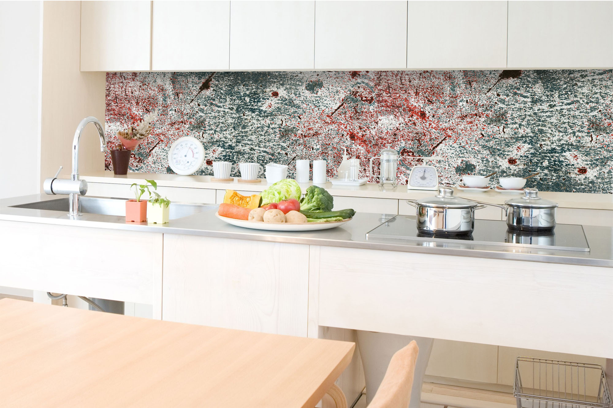 Küchenrückwandfolie lässt sich ausschließlich auf die nicht-saugfähige Unterlage kleben (Glas, Holz, keramische Fließen).