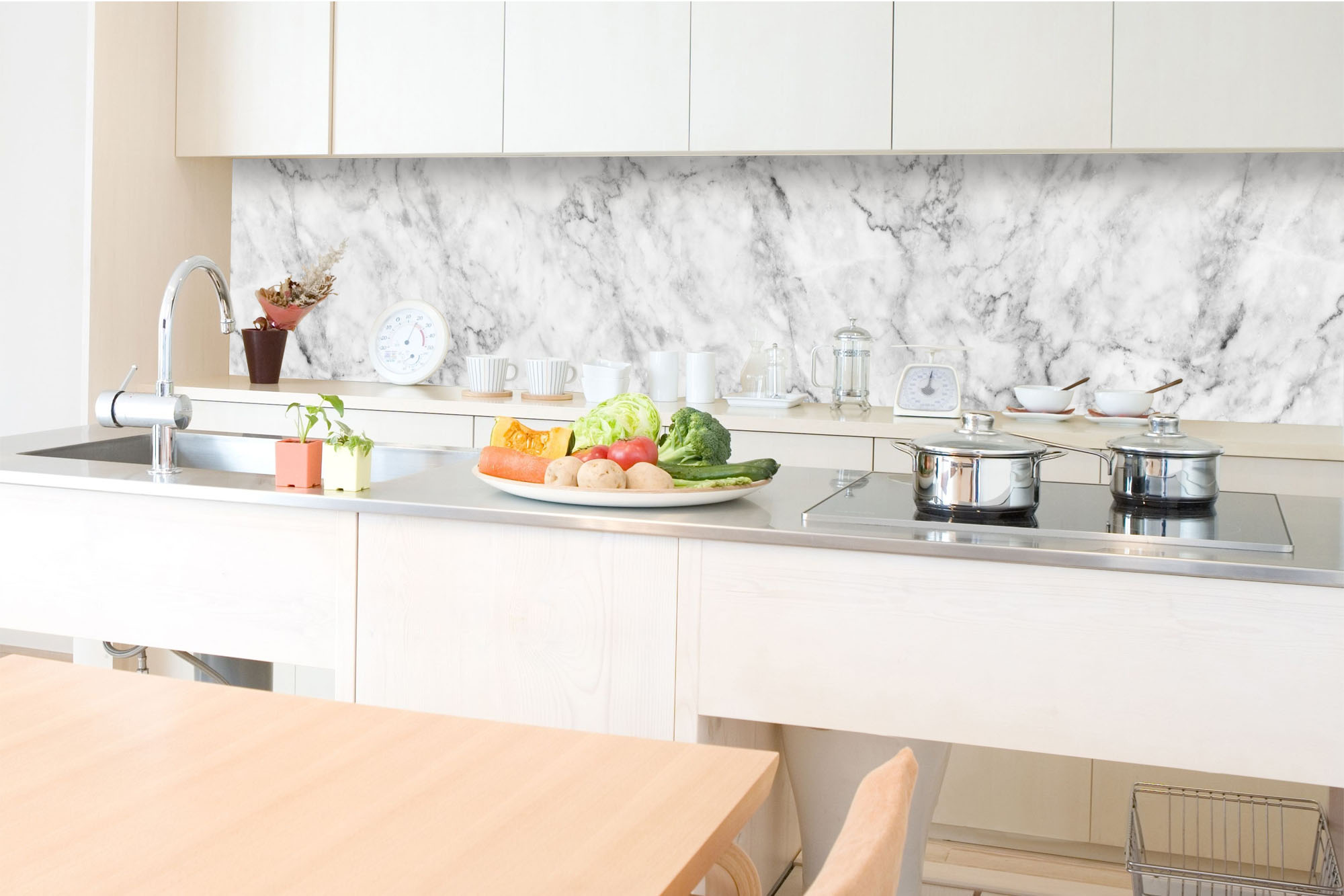 Küchenrückwandfolie lässt sich ausschließlich auf die nicht-saugfähige Unterlage kleben (Glas, Holz, keramische Fließen).