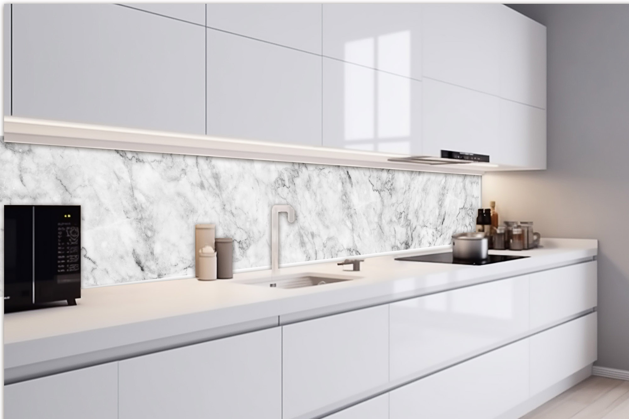 Küchenrückwandfolie lässt sich ausschließlich auf die nicht-saugfähige Unterlage kleben (Glas, Holz, keramische Fließen).
