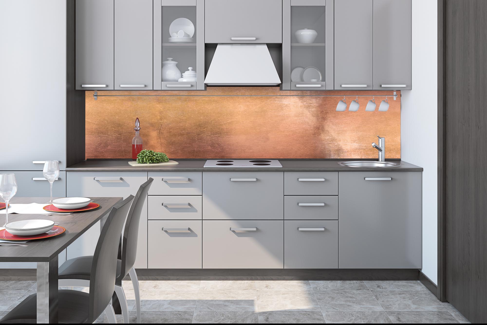 Küchenrückwandfolie lässt sich ausschließlich auf die nicht-saugfähige Unterlage kleben (Glas, Holz, keramische Fließen).