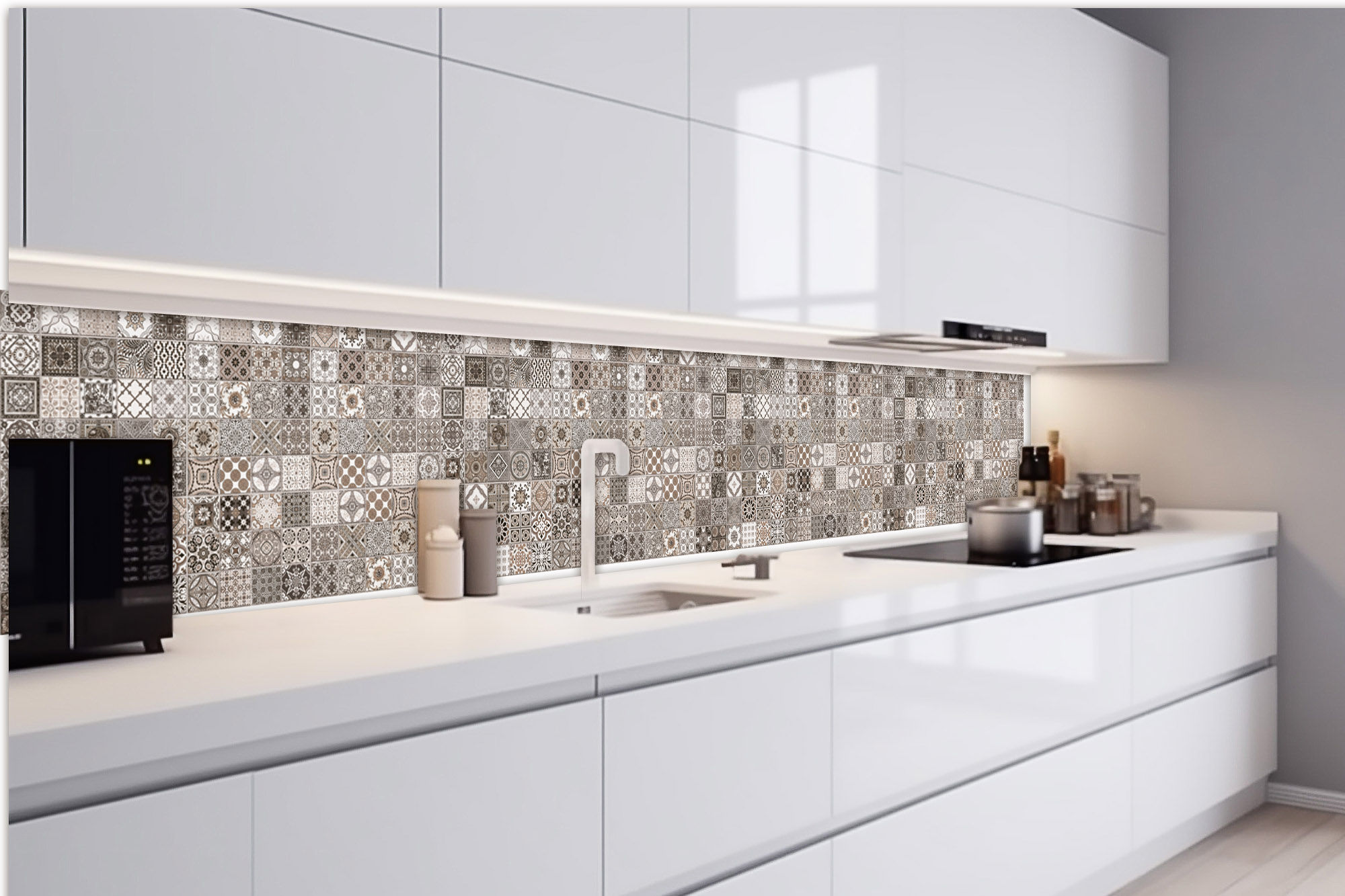 Küchenrückwandfolie lässt sich ausschließlich auf die nicht-saugfähige Unterlage kleben (Glas, Holz, keramische Fließen).