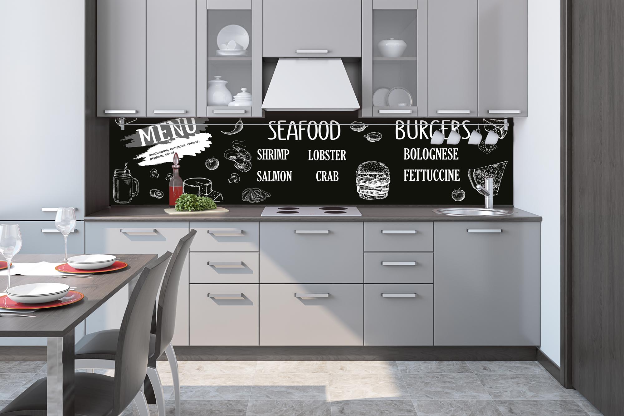 Küchenrückwandfolie lässt sich ausschließlich auf die nicht-saugfähige Unterlage kleben (Glas, Holz, keramische Fließen).