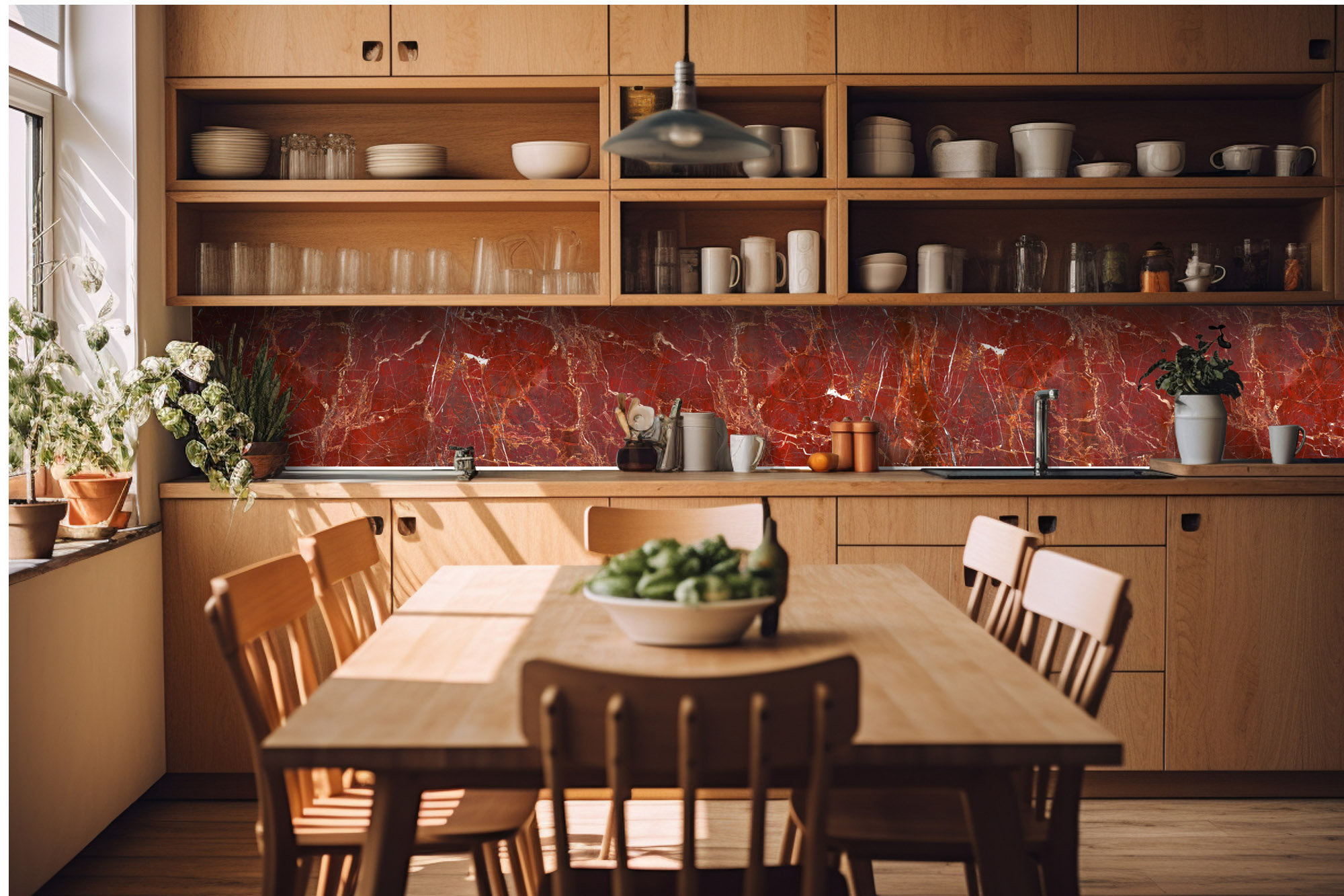 Küchenrückwandfolie lässt sich ausschließlich auf die nicht-saugfähige Unterlage kleben (Glas, Holz, keramische Fließen).