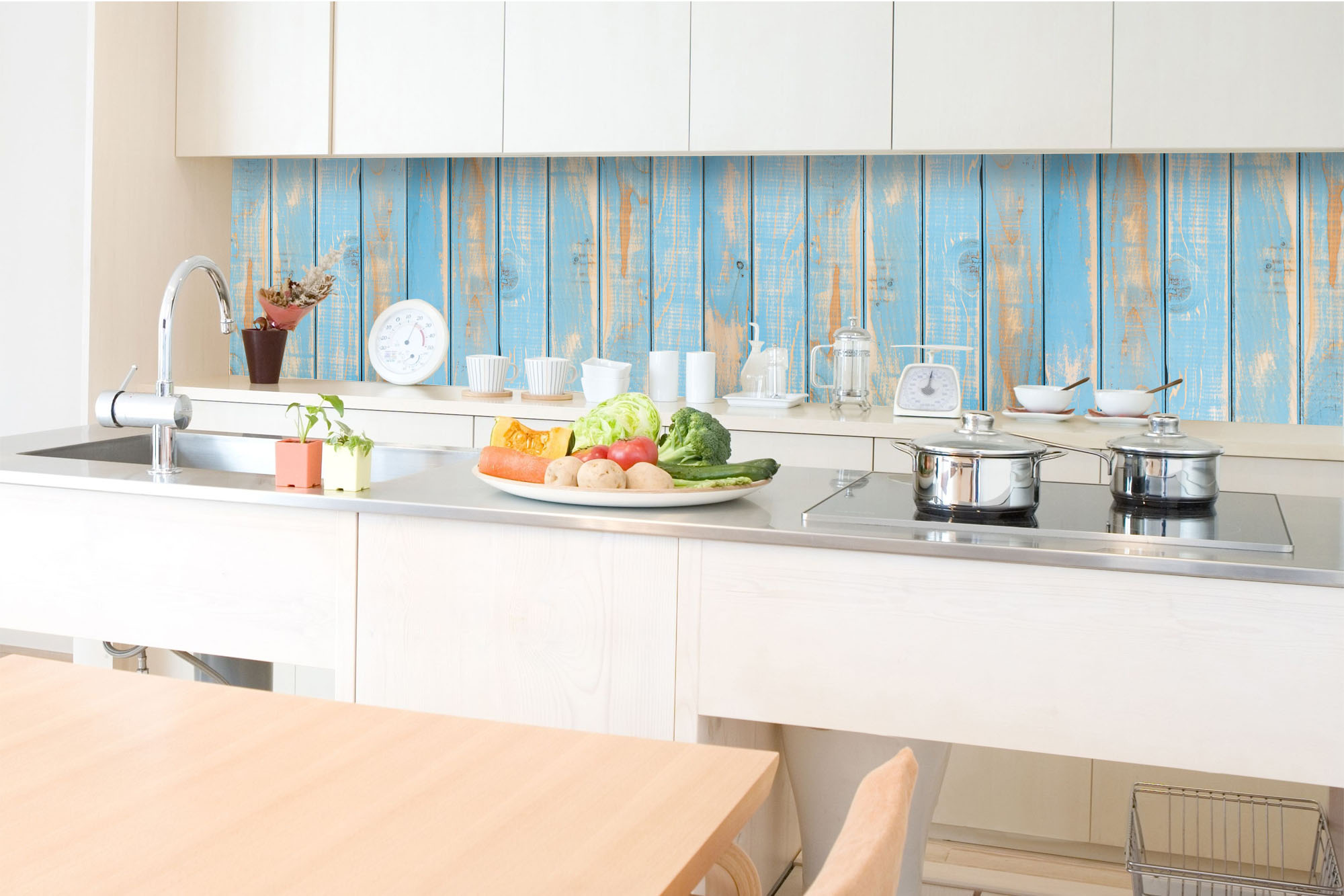 Küchenrückwandfolie lässt sich ausschließlich auf die nicht-saugfähige Unterlage kleben (Glas, Holz, keramische Fließen).