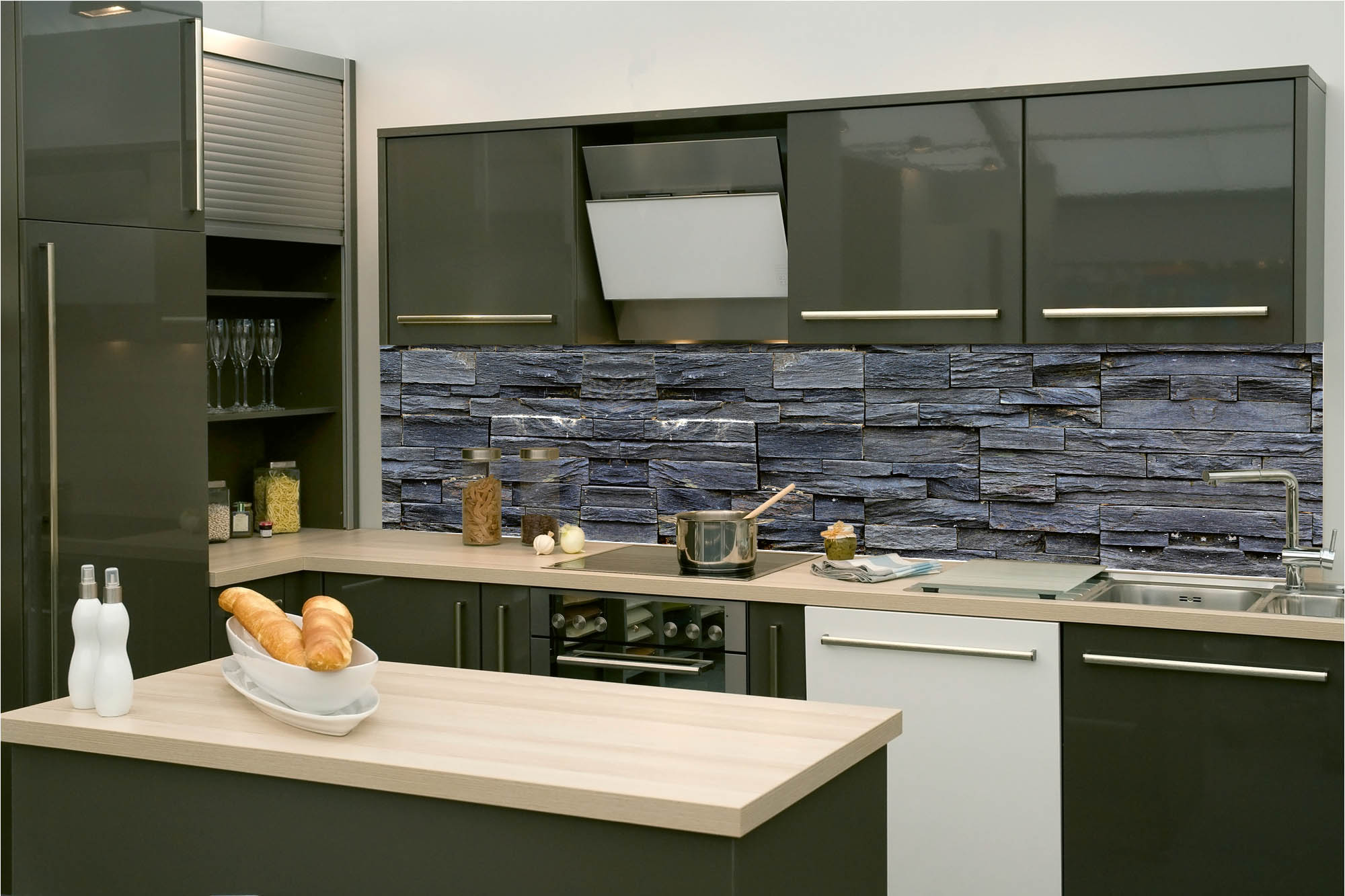 Küchenrückwandfolie lässt sich ausschließlich auf die nicht-saugfähige Unterlage kleben (Glas, Holz, keramische Fließen).