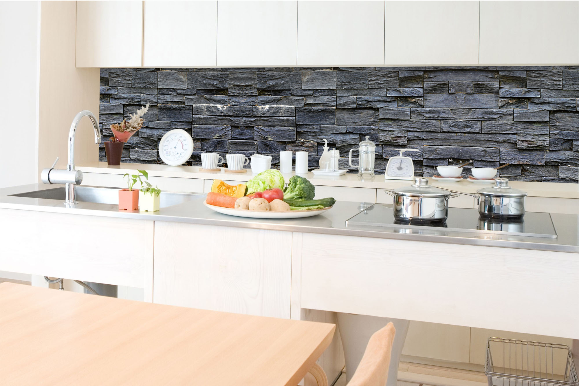 Küchenrückwandfolie lässt sich ausschließlich auf die nicht-saugfähige Unterlage kleben (Glas, Holz, keramische Fließen).