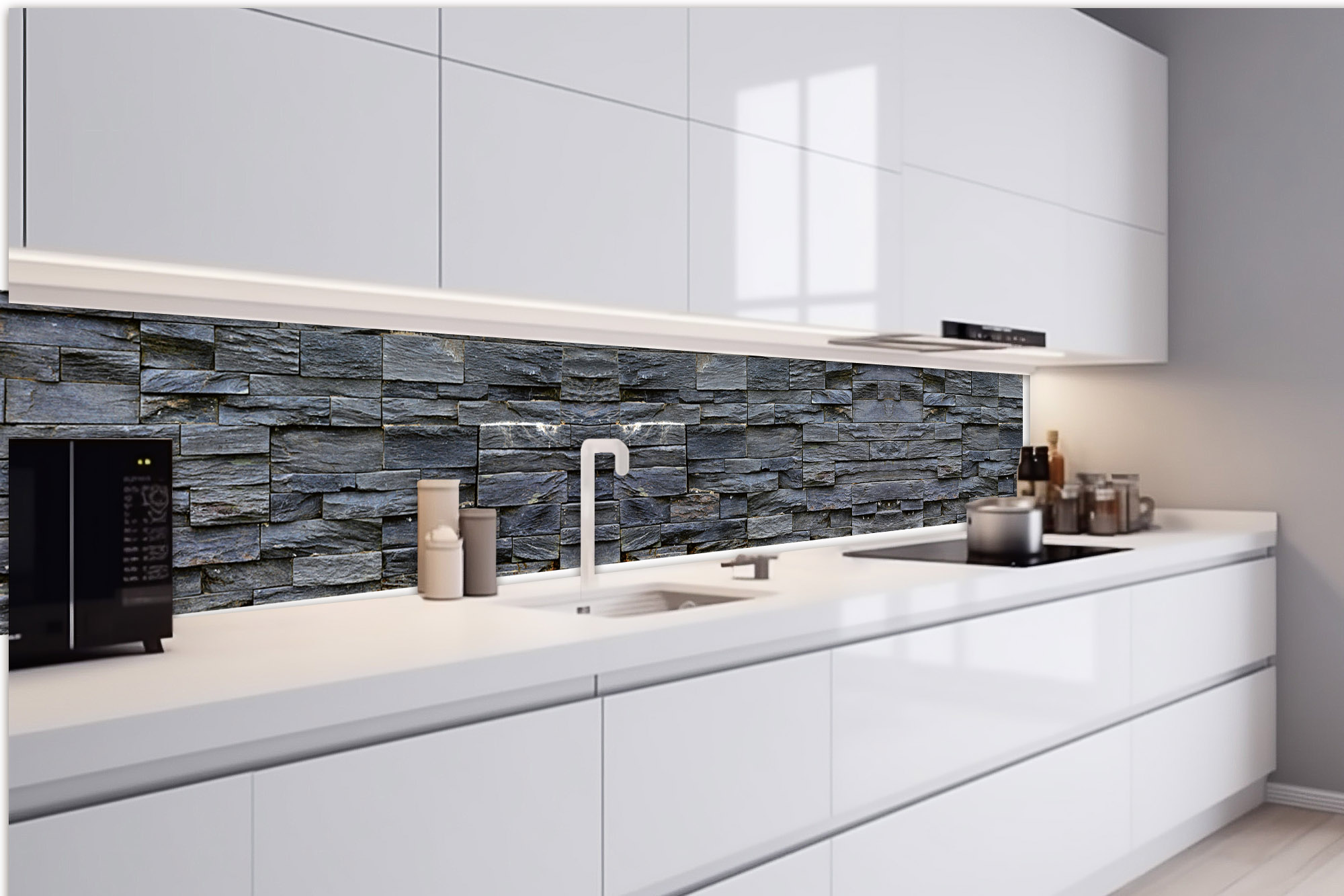 Küchenrückwandfolie lässt sich ausschließlich auf die nicht-saugfähige Unterlage kleben (Glas, Holz, keramische Fließen).