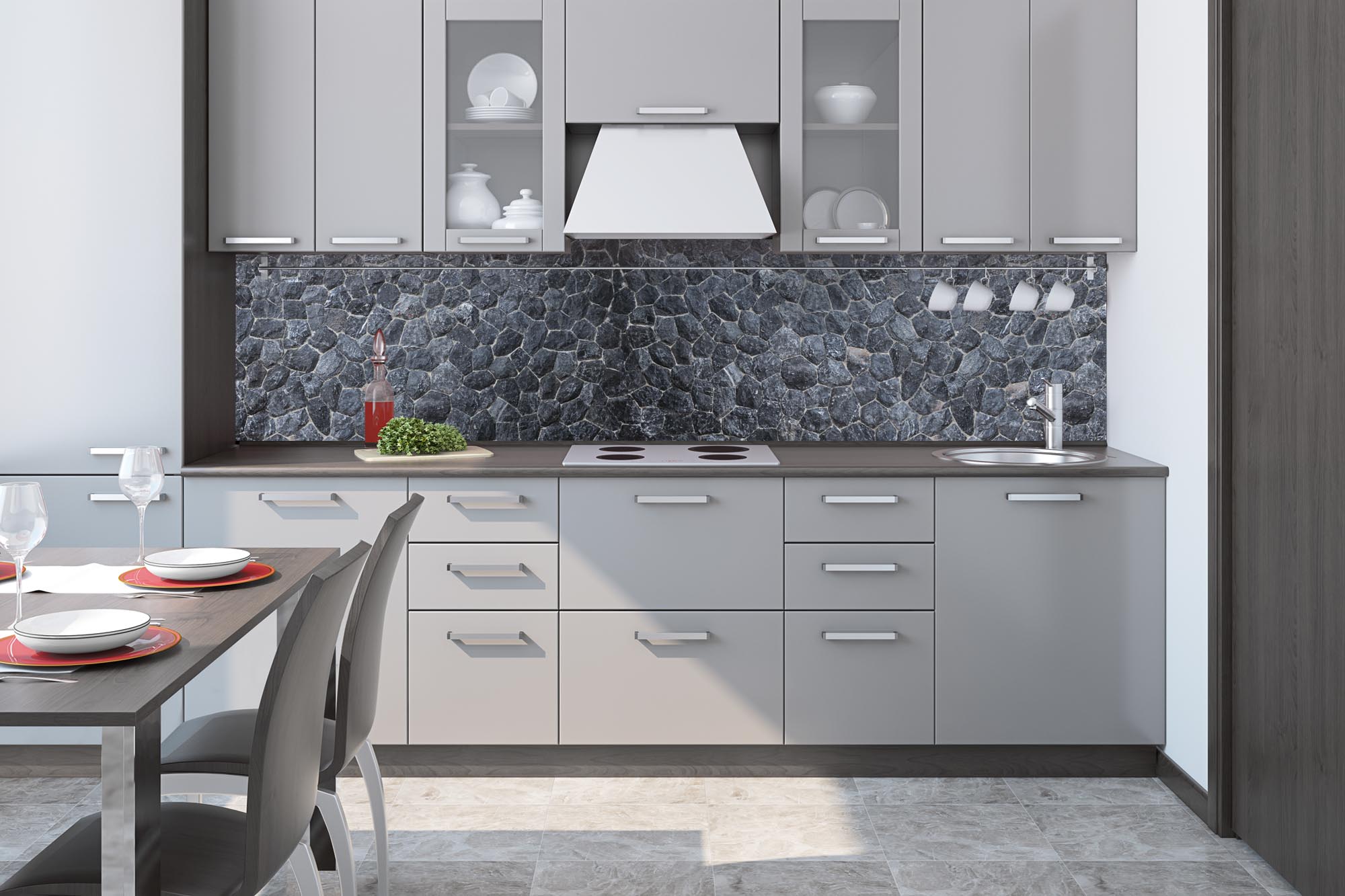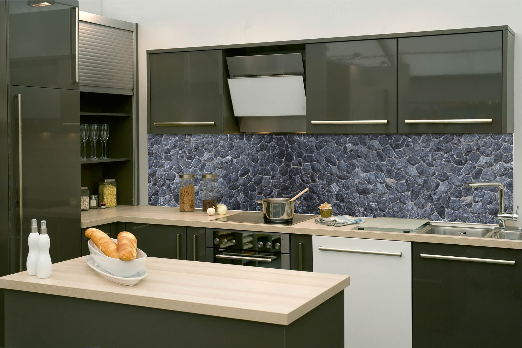Küchenrückwandfolie lässt sich ausschließlich auf die nicht-saugfähige Unterlage kleben (Glas, Holz, keramische Fließen).