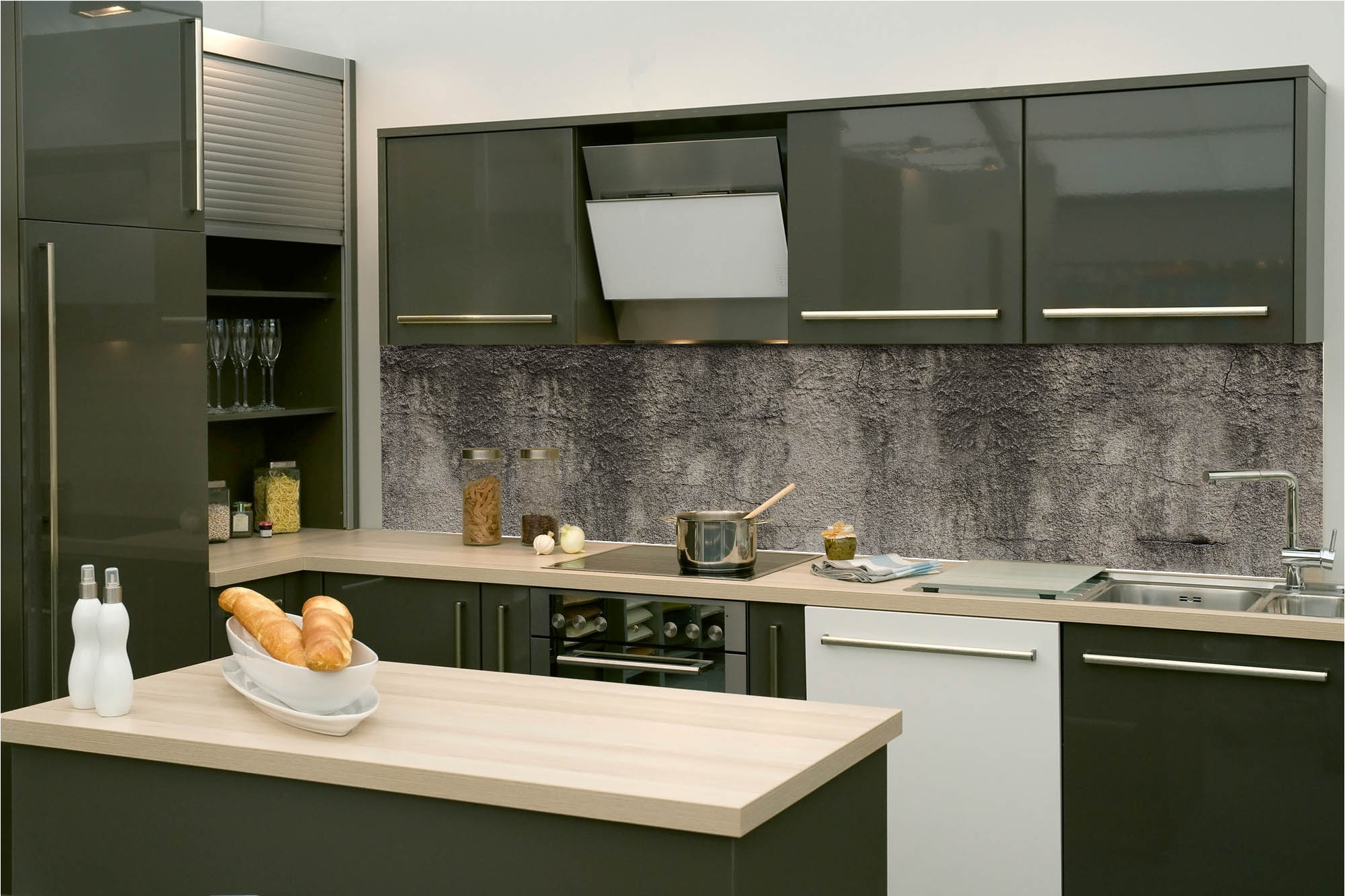 Küchenrückwandfolie lässt sich ausschließlich auf die nicht-saugfähige Unterlage kleben (Glas, Holz, keramische Fließen).