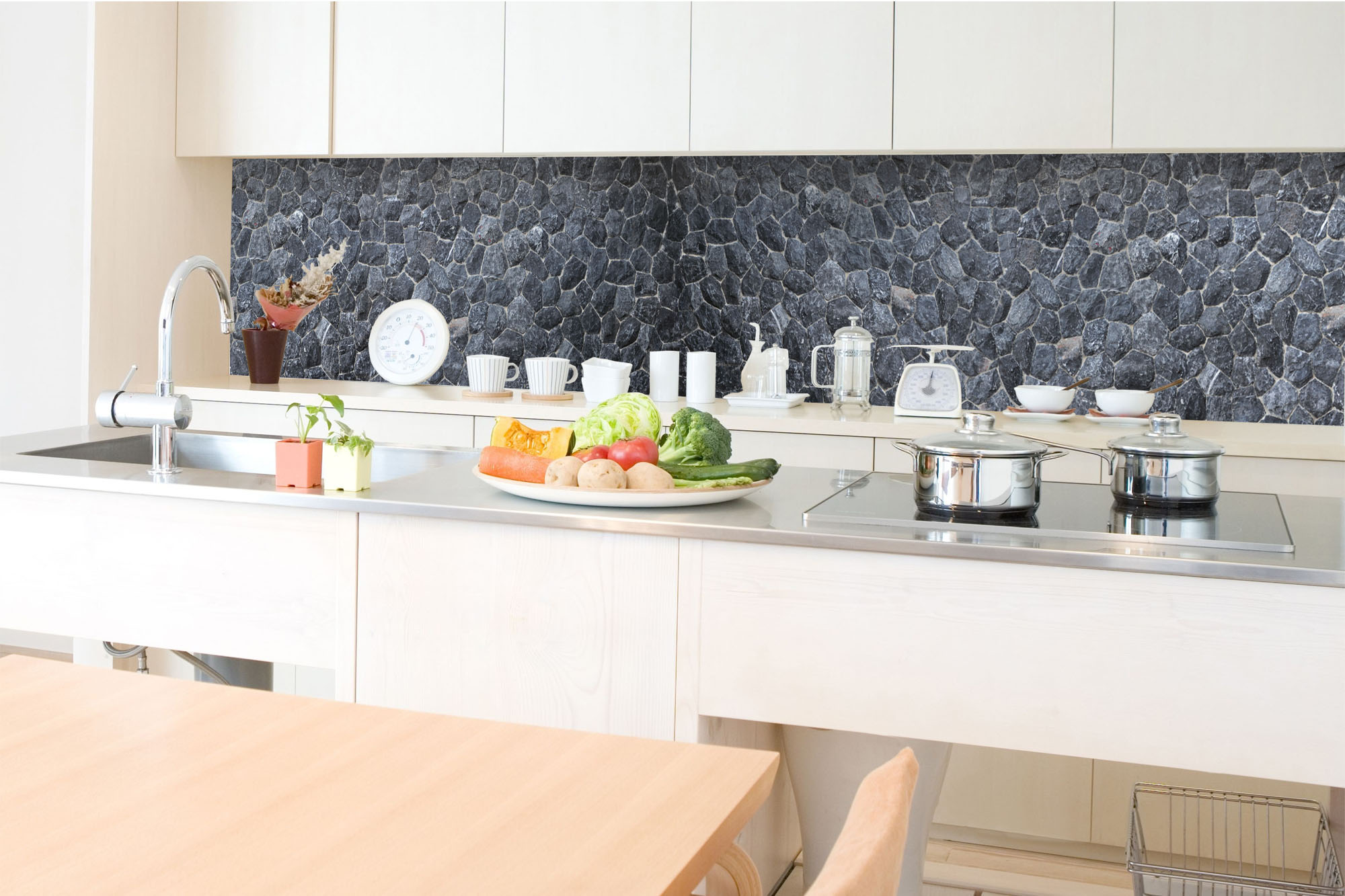 Küchenrückwandfolie lässt sich ausschließlich auf die nicht-saugfähige Unterlage kleben (Glas, Holz, keramische Fließen).