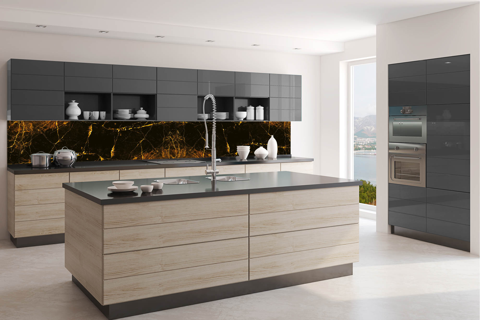 Küchenrückwandfolie lässt sich ausschließlich auf die nicht-saugfähige Unterlage kleben (Glas, Holz, keramische Fließen).