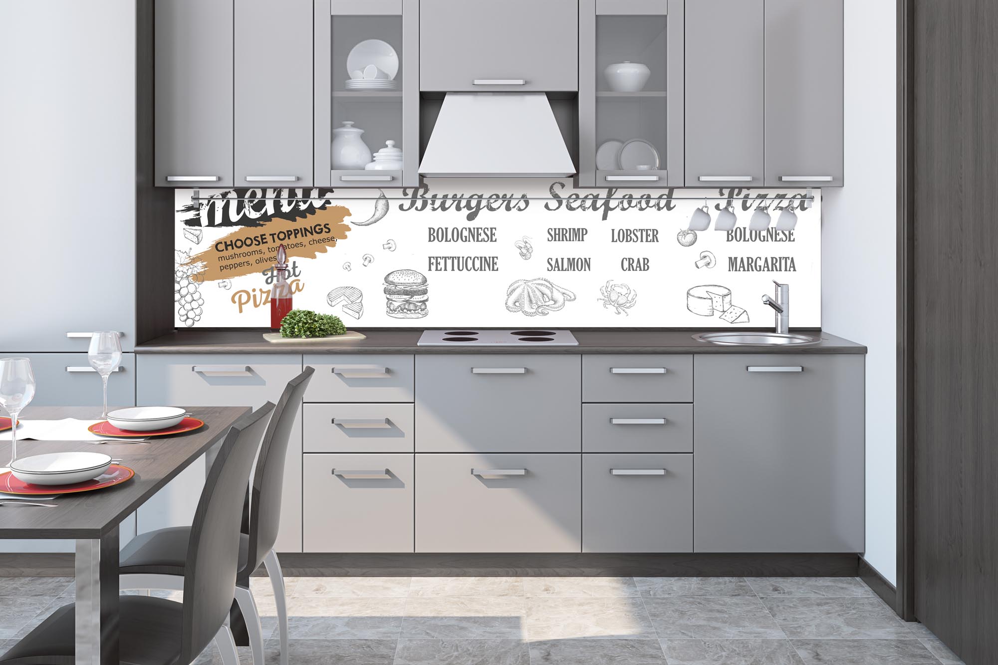 Küchenrückwandfolie lässt sich ausschließlich auf die nicht-saugfähige Unterlage kleben (Glas, Holz, keramische Fließen).