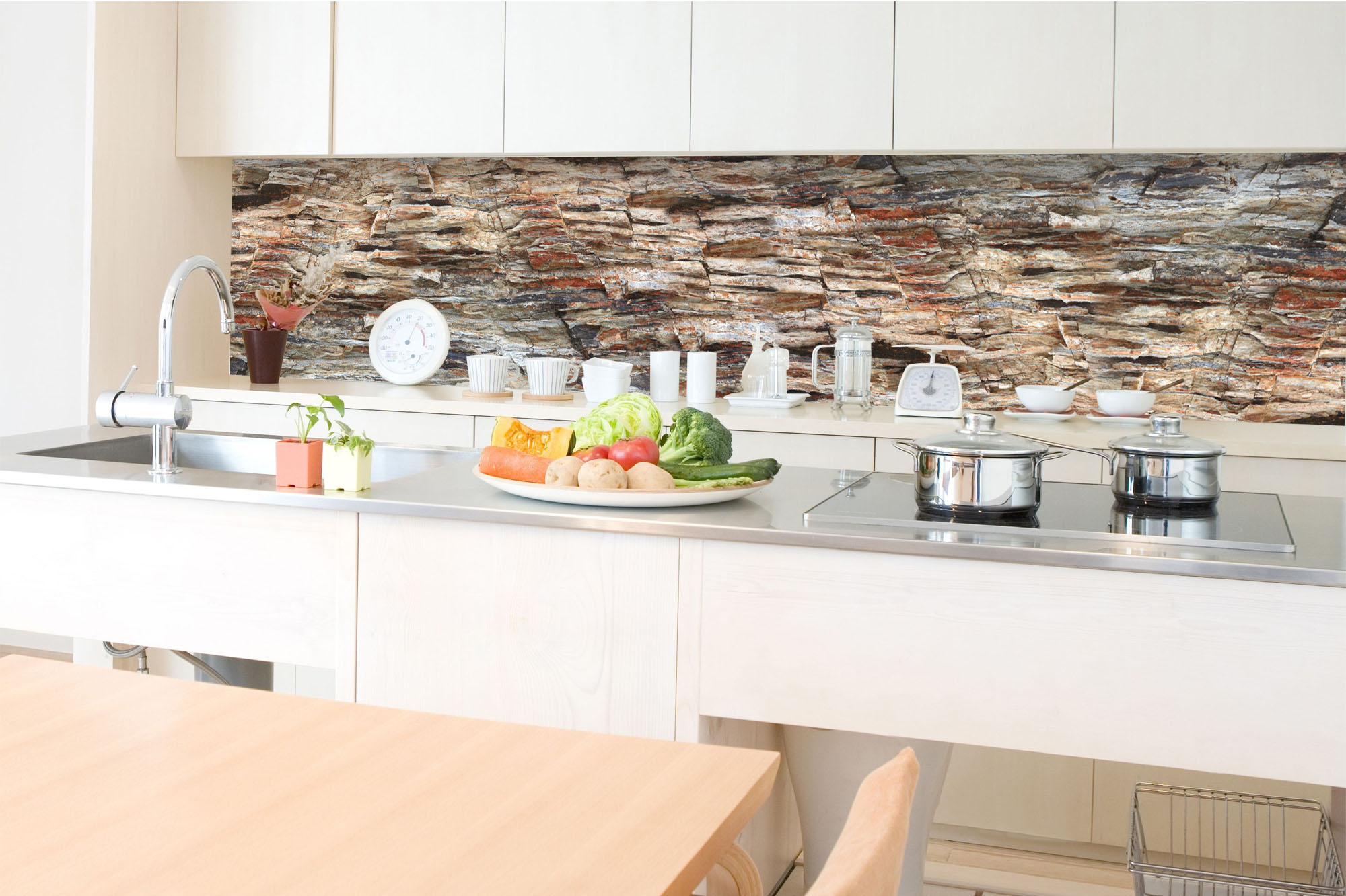 Die neusten Trends im Bereich Küchengestaltung machen auf selbstklebende Fototapeten für die Küchenrückwand aufmerksam. Anstelle einer Fliesenwand in der Küche kann die Rückwand mit einer Folie bedeckt werden.