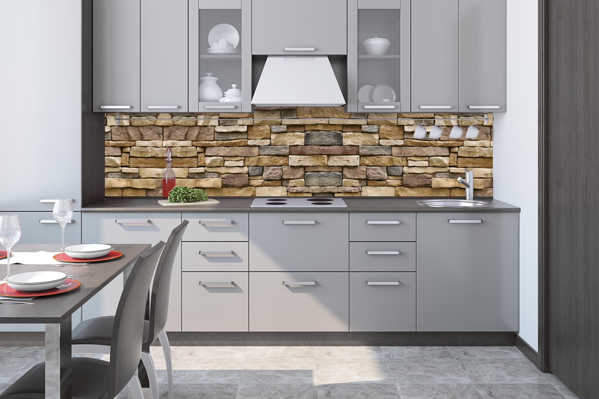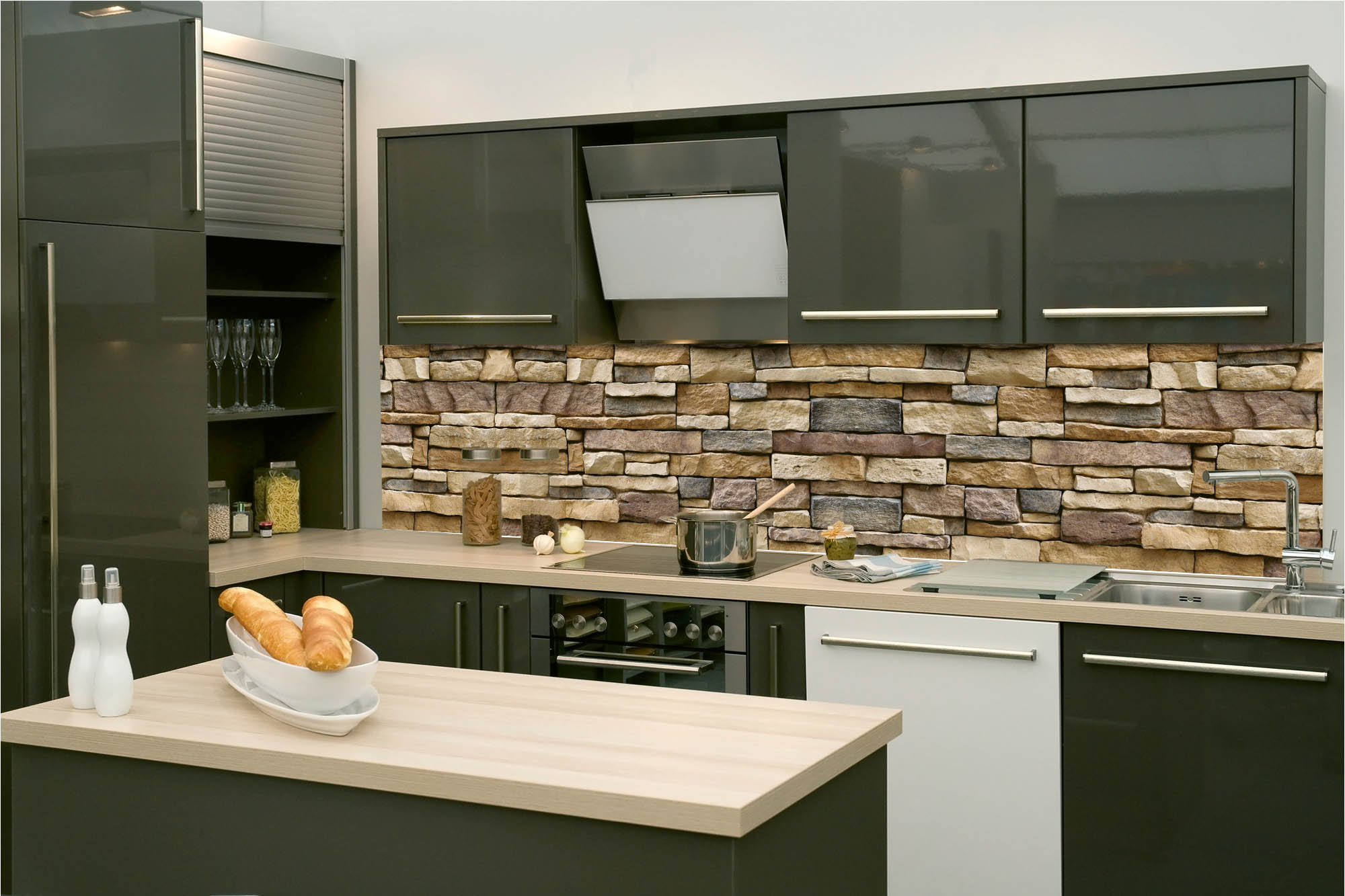Küchenrückwandfolie lässt sich ausschließlich auf die nicht-saugfähige Unterlage kleben (Glas, Holz, keramische Fließen).