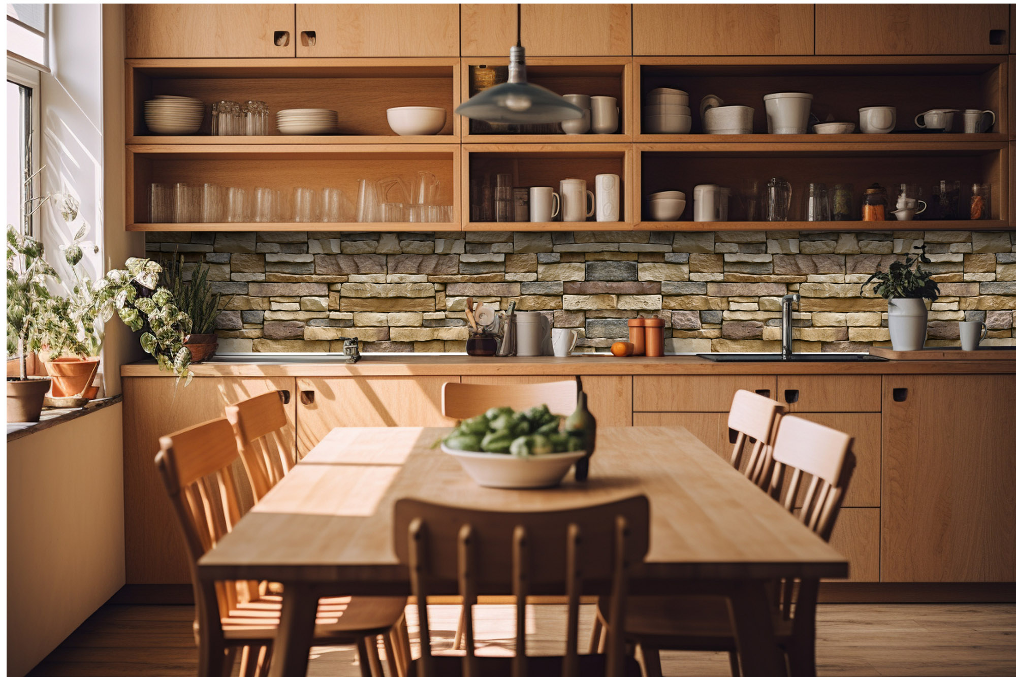Küchenrückwandfolie lässt sich ausschließlich auf die nicht-saugfähige Unterlage kleben (Glas, Holz, keramische Fließen).