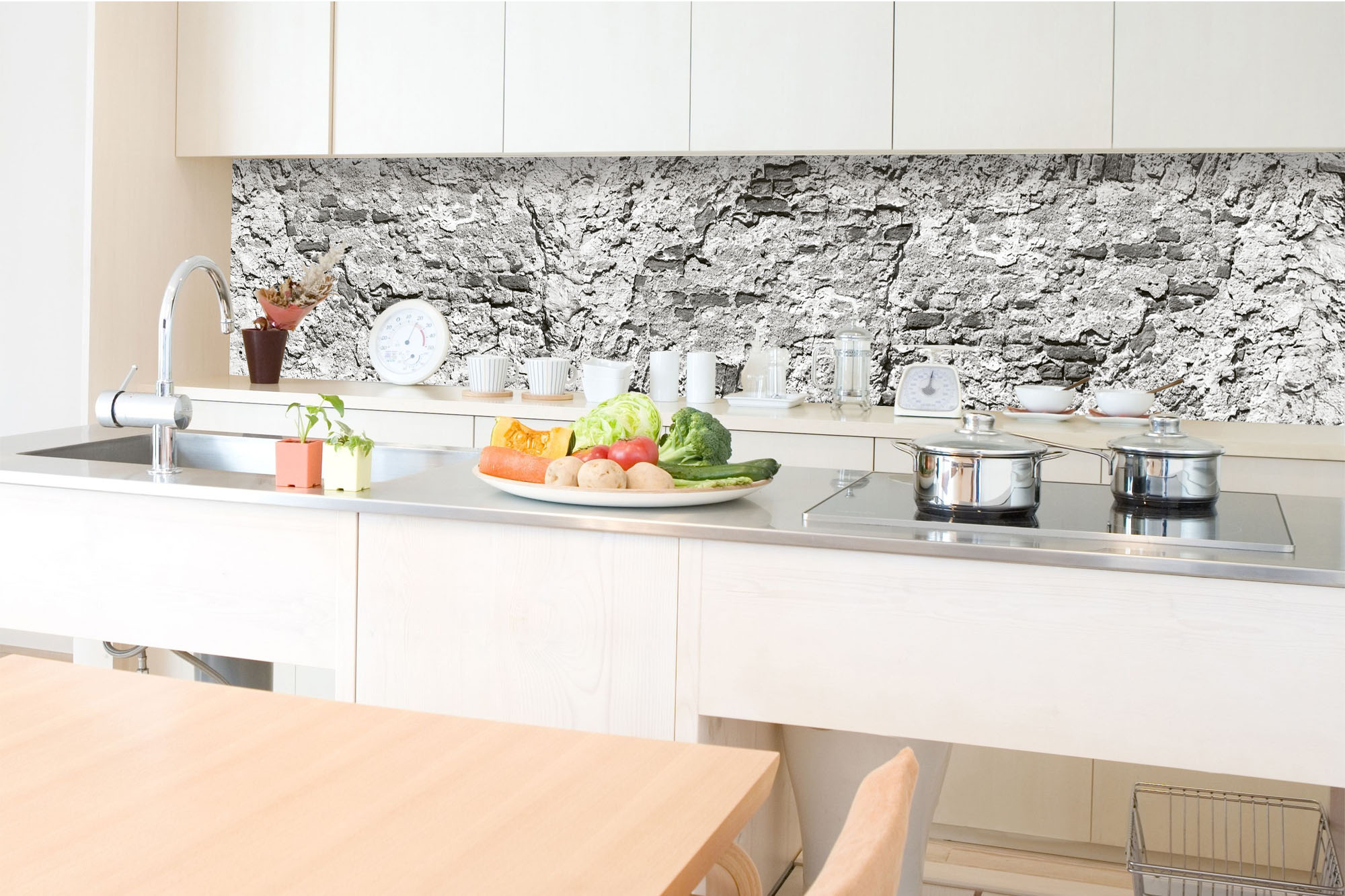 Küchenrückwandfolie lässt sich ausschließlich auf die nicht-saugfähige Unterlage kleben (Glas, Holz, keramische Fließen).