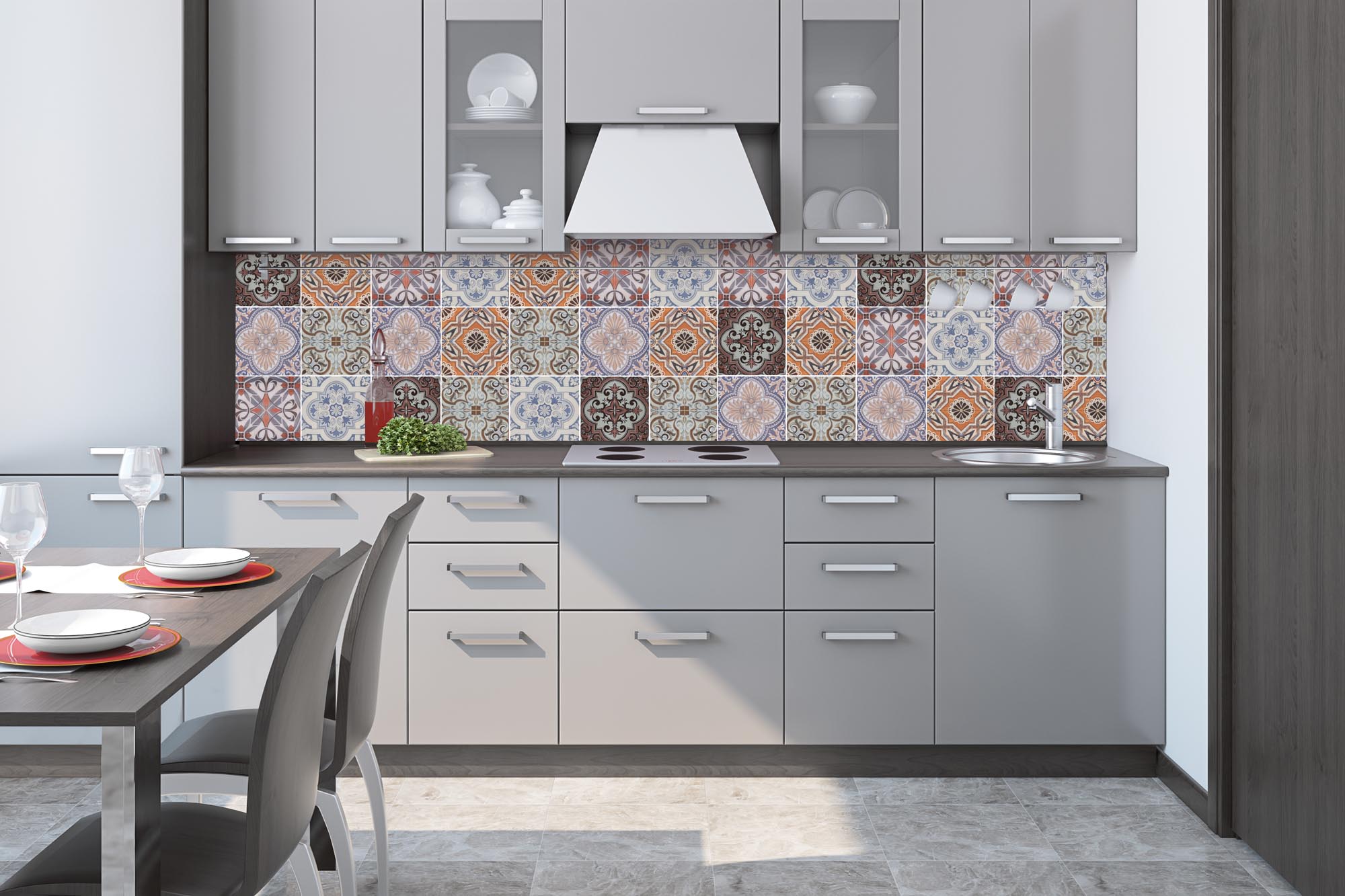 Küchenrückwandfolie lässt sich ausschließlich auf die nicht-saugfähige Unterlage kleben (Glas, Holz, keramische Fließen).