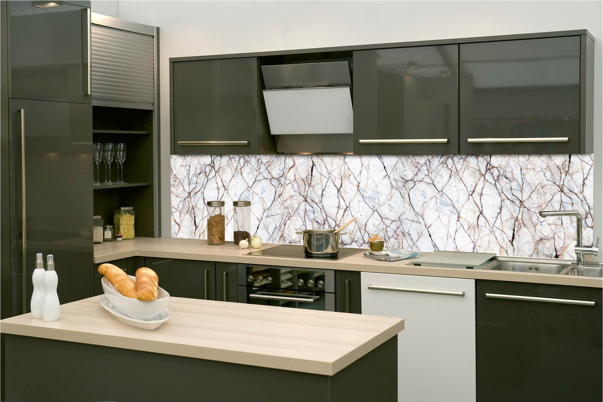 Die neusten Trends im Bereich Küchengestaltung machen auf selbstklebende Fototapeten für die Küchenrückwand aufmerksam. Anstelle einer Fliesenwand in der Küche kann die Rückwand mit einer Folie bedeckt werden.
