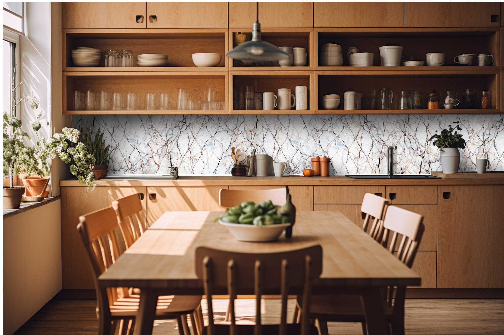 Küchenrückwandfolie lässt sich ausschließlich auf die nicht-saugfähige Unterlage kleben (Glas, Holz, keramische Fließen).