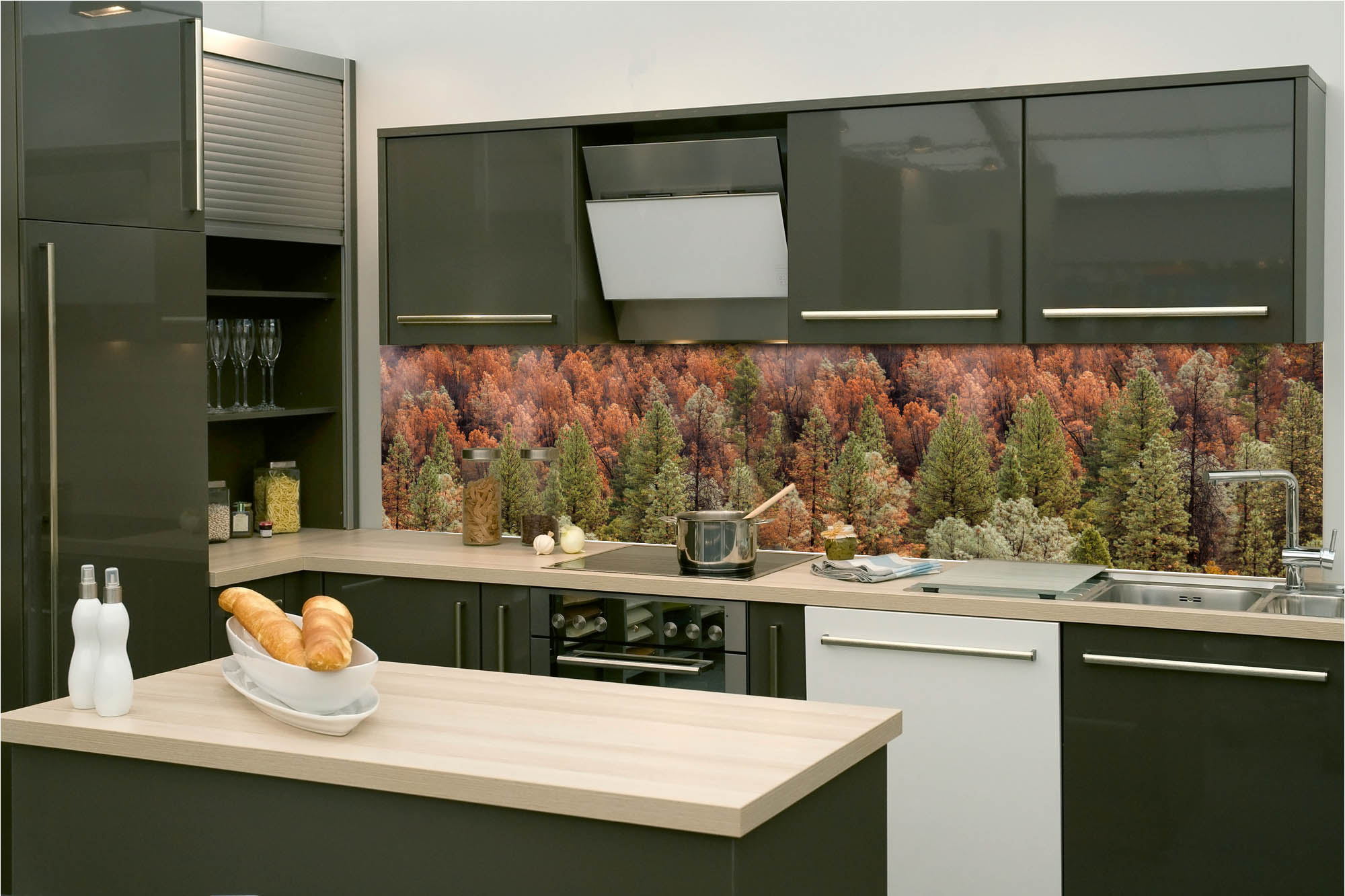 Die neusten Trends im Bereich Küchengestaltung machen auf selbstklebende Fototapeten für die Küchenrückwand aufmerksam. Anstelle einer Fliesenwand in der Küche kann die Rückwand mit einer Folie bedeckt werden.