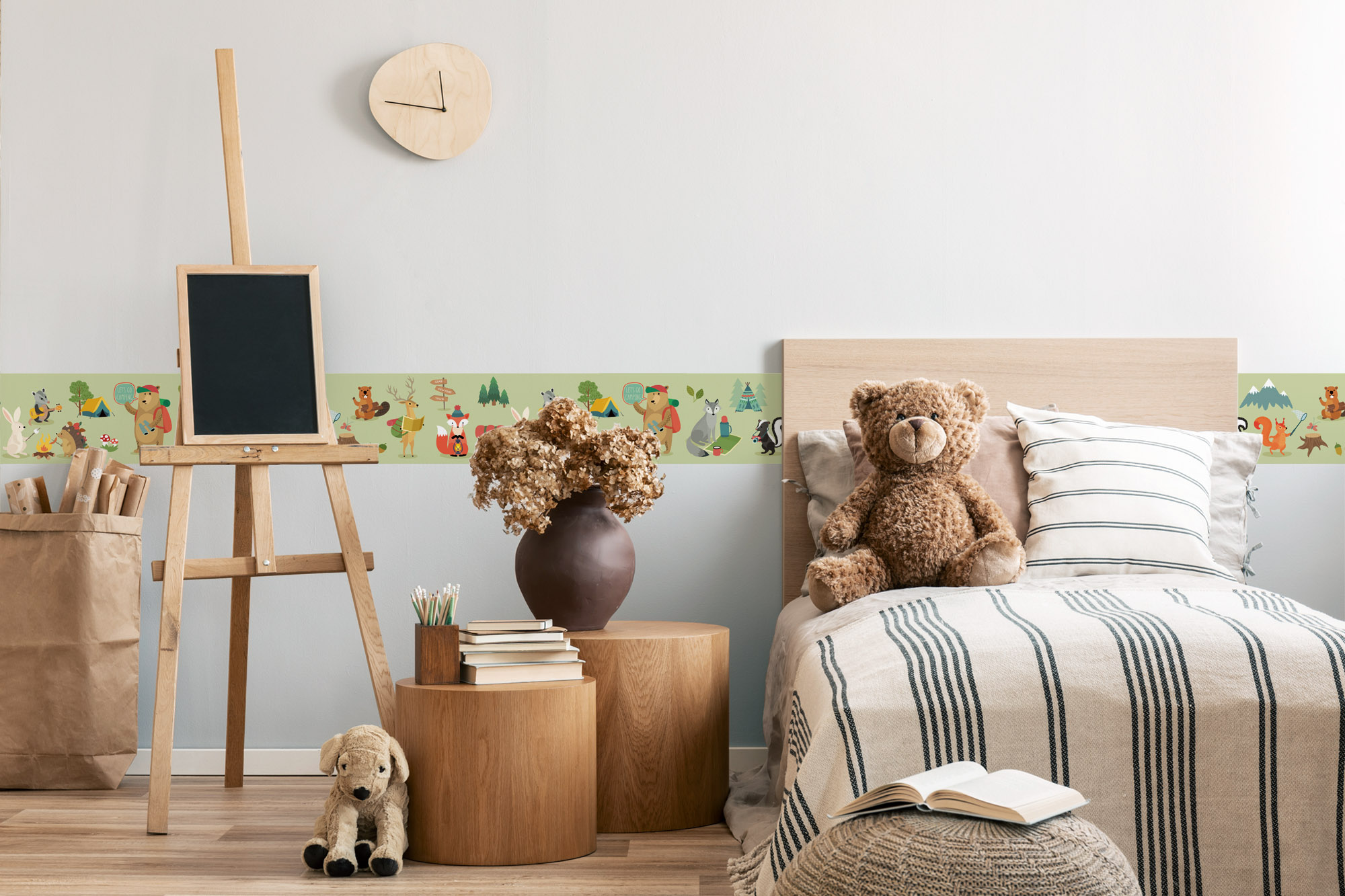 Anschließend können Sie die Größe des Randes auf der Fläche ausmessen, auf die Sie ihn kleben möchten. Das Aufkleben selbst ist ganz einfach - einfach das rückseitige Schutzpapier abziehen und die selbstklebende Bordüre einfach aufkleben. Kleben Sie die Bordüre mit der Handfläche oder einem Tuch fest auf den Untergrund, sodass sie vollflächig haftet.